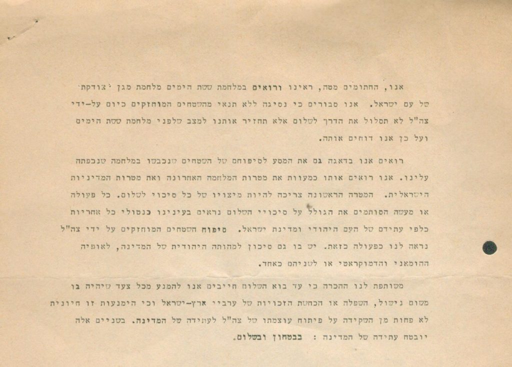 באות ג’ נמצא גילוי דעת של אקדמאים, מרצים ומחנכים נגד סיפוח השטחים, 18/11/1967; ועוד מנשר משותף של סופרים יהודים וערבים, ללא תאריך.