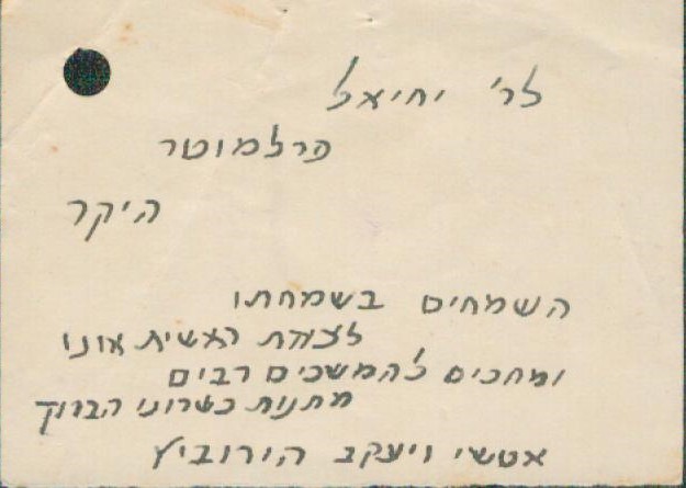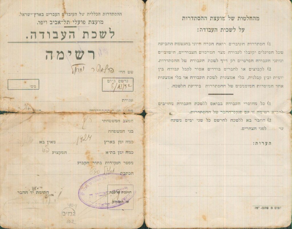 ועוד באות א’, אנו מוצאים אישור על רישום בלשכת העבודה, מ- 8/11/1932. השם: יחיאל פרלמוטר. המקצוע: פועל פשוט.