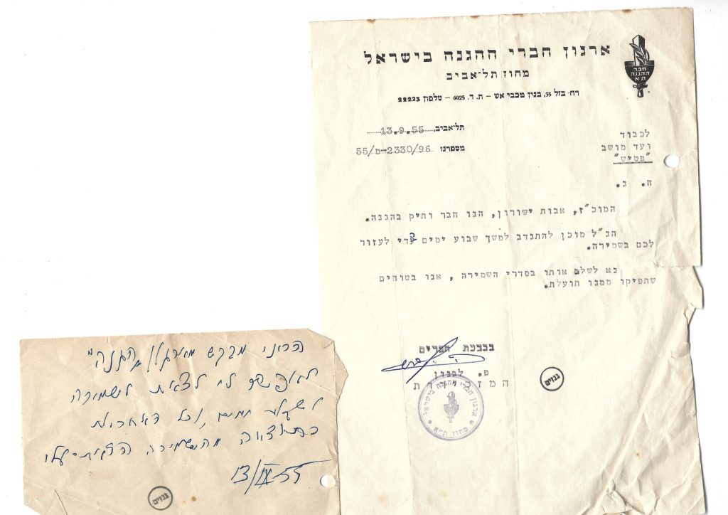באות א’ נמצא את המעטפה “אגרות לחברים” ובה אגרות של ארגון חברי ההגנה. במעטפה נפרדת נמצא תעודה שהוענקה לחברי ההגנה בשנת 1964, וכן כרטיס חבר בארגון. ישורון היה גאה בשירותו בהגנה וגם, מאוחר יותר, בצה”ל. במעטפה “מסמכים צבאיים” נמצא צווי קריאה למילואים, אישורי חופשה וכיוצא באלה -כולם נשמרו על ידיו. הראשון בהם מנובמבר 1948; האחרון מיוני 1953. במגרותיו נשמרה אפילו מטרת אימונים שלקח למזכרת מאחד המטווחים.